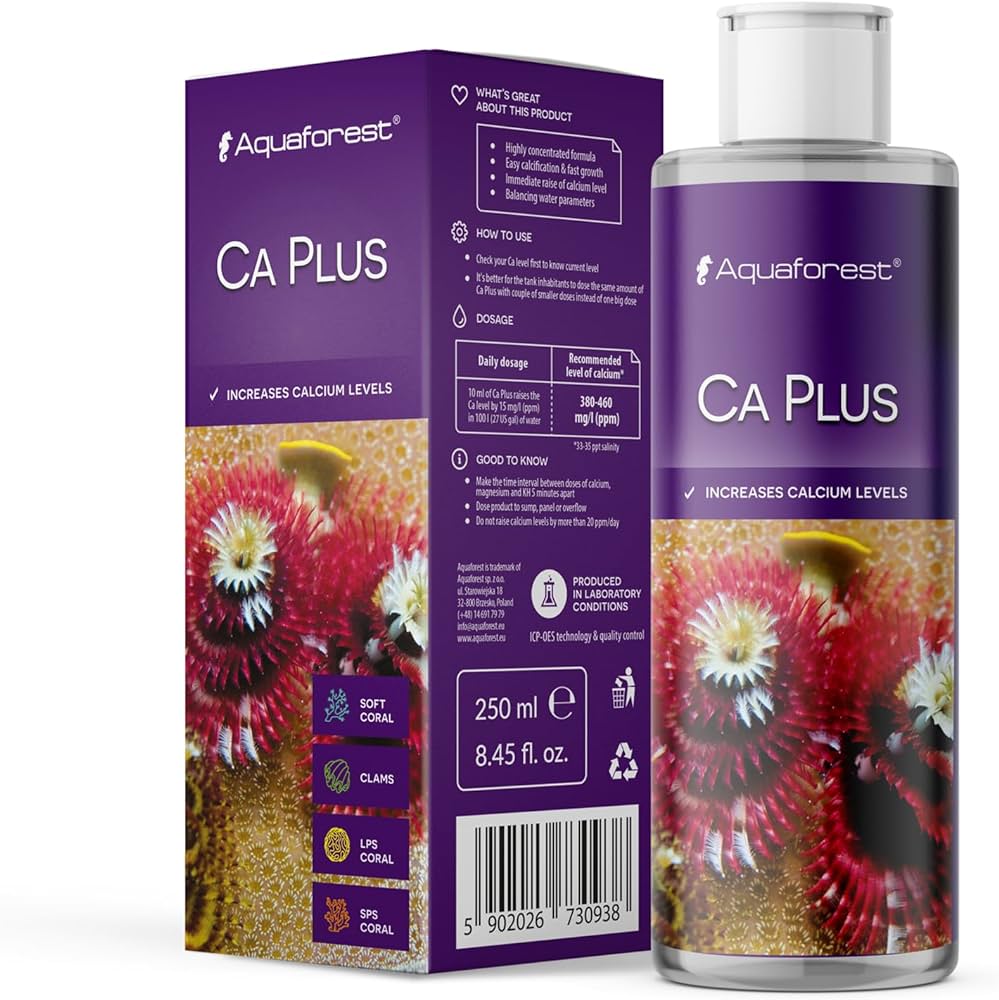 Dosage: 10 ml of Ca Plus raises the calcium level by 15 mg/l (ppm) in 100 l (27 US gal) of water. Maximum daily dose is 20 ml of Ca Plus per 100 l (27 US gal) of water. Recommended calcium level in reef aquarium is 380-460/l (ppm). Please ensure your magnesium level is within the recommended range before attempting to raise or adjust your calcium and alkalinity levels.