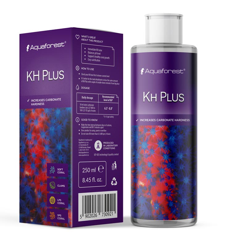 Dosage: 10 ml of KH Plus solution raises carbonate hardness by 0.25 dKH in 100 l (27 US gal) of water. Carbonate hardness in reef aquarium should be about 6.5 -8.5 dKH. Do not raise dKH more than 0.5 dKH per 24 hours. Please ensure your magnesium level is within the recommended range before attempting to raise or adjust your calcium and alkalinity levels.
