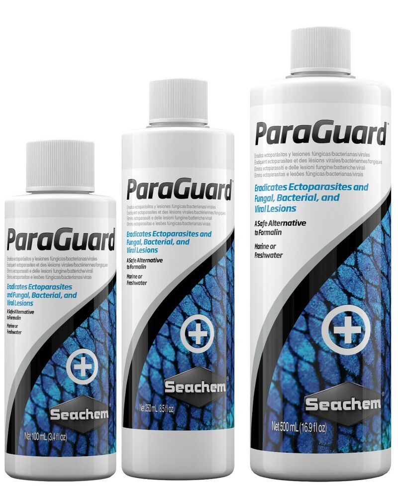 ParaGuard™ is the only fish and filter safe aldehyde based (10% by weight) parasite control product available. Unlike highly toxic and difficult to use formalin based medications, ParaGuard™ contains no formaldehyde or methanol and will not alter pH. ParaGuard™ employs a proprietary, synergistic blend of aldehydes, malachite green, and fish protective polymers that effectively and efficiently eradicates many ectoparasites on fish (e.g. ich, etc.) and external fungal/bacterial/viral lesions (e.g., fin rot). It is particularly useful in hospital and receiving tanks for new fish and whenever new fish are introduced to a community tank. For use in freshwater or marine.