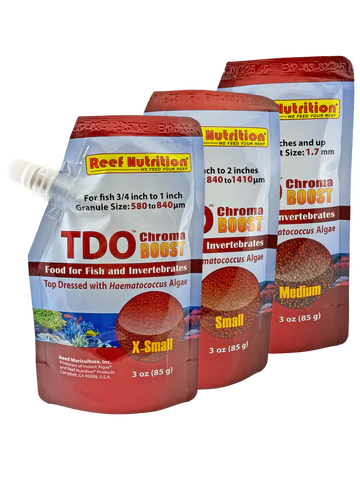 TDO Chroma BOOST is a granulated and pelleted fish and coral feed "top-dressed" with Haematococcus (which provides an excellent source of astaxanthin) for vibrant color and superior nutrition.