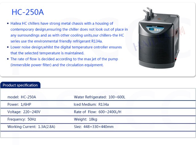 Hailea HC chillers have strong metal chassis with a housing of contemporary design,ensuring the chiller does not look out of place in any surroundings and as with other cooling units,our chillers-the HC series use the environmental friendly refrigerant R134a.