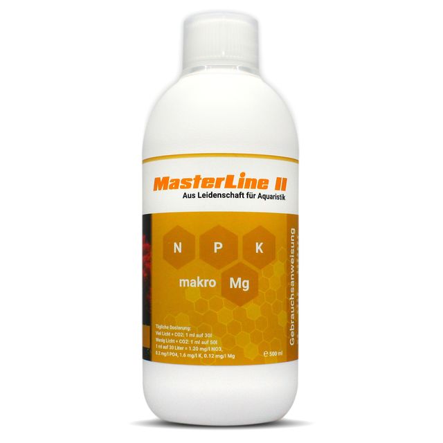 MasterLine II is a concentrated macronutrient fertiliser for aquatic plants. It contains nitrogen, phosphorus, potassium and magnesium. It is recommended to use MasterLine II together with MasterLine I and MasterLine Carbo. In this way the aquatic plants have all the nutrients necessary for healthy growth. MasterLine II offers the possiblity of dosing on a weekly basis.
